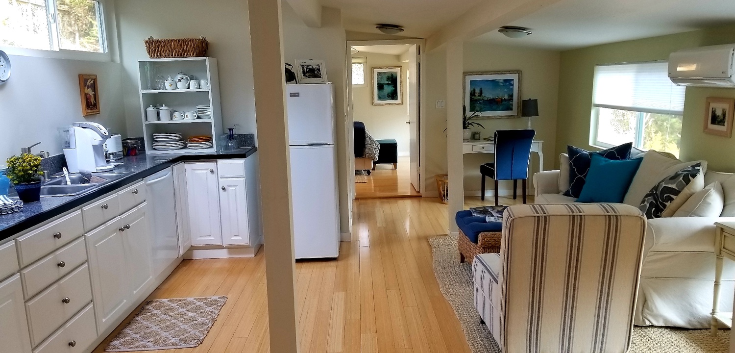 - Kitchen area with table and two chairs, electric stove, fridge, and dishwasher.