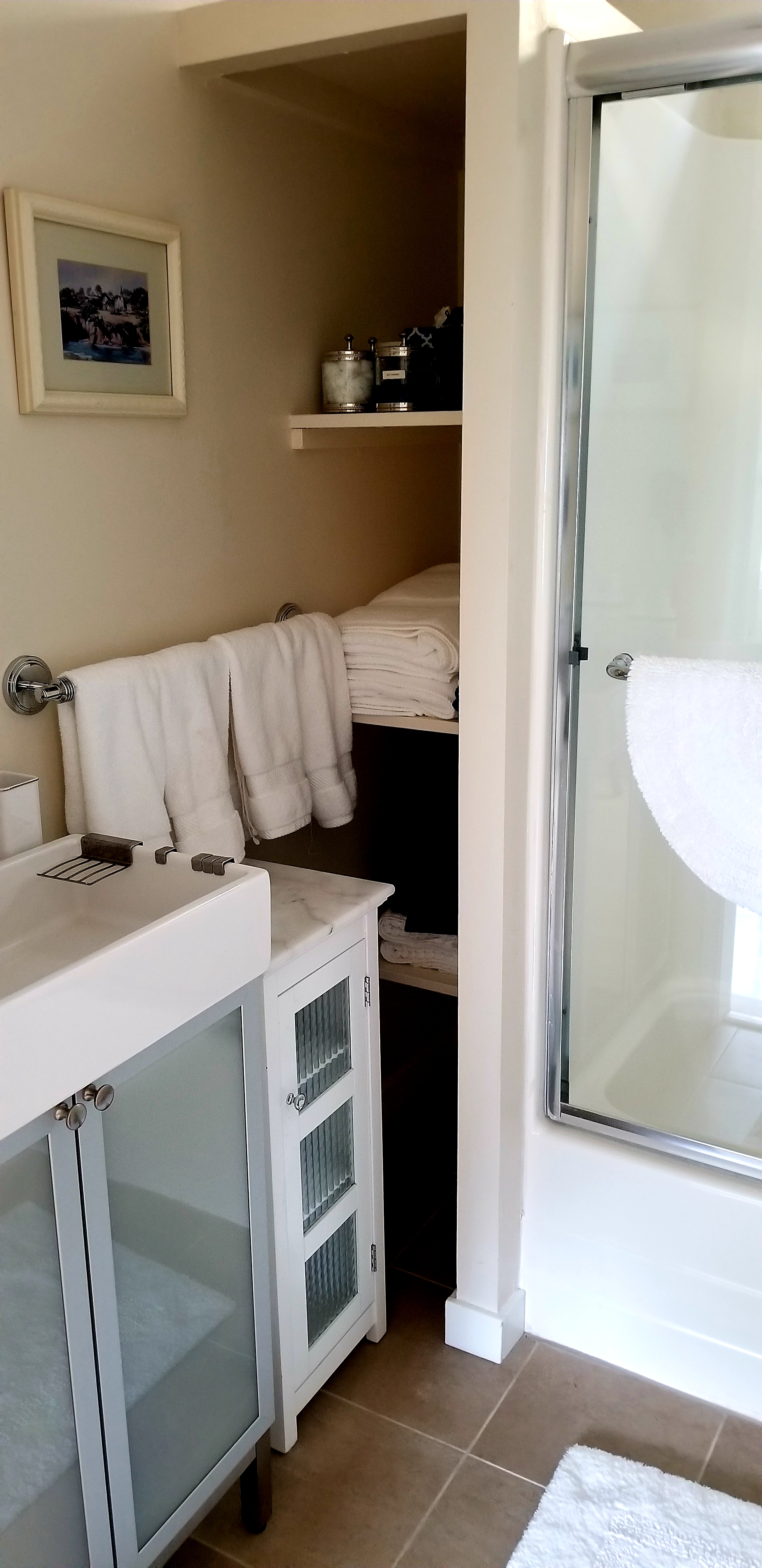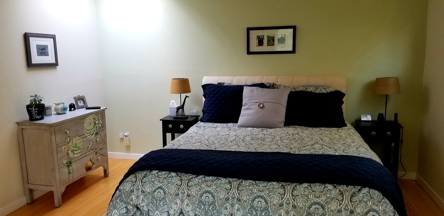- Bedroom with queen bed, three drawer dresser, TV, closet, and skylight.