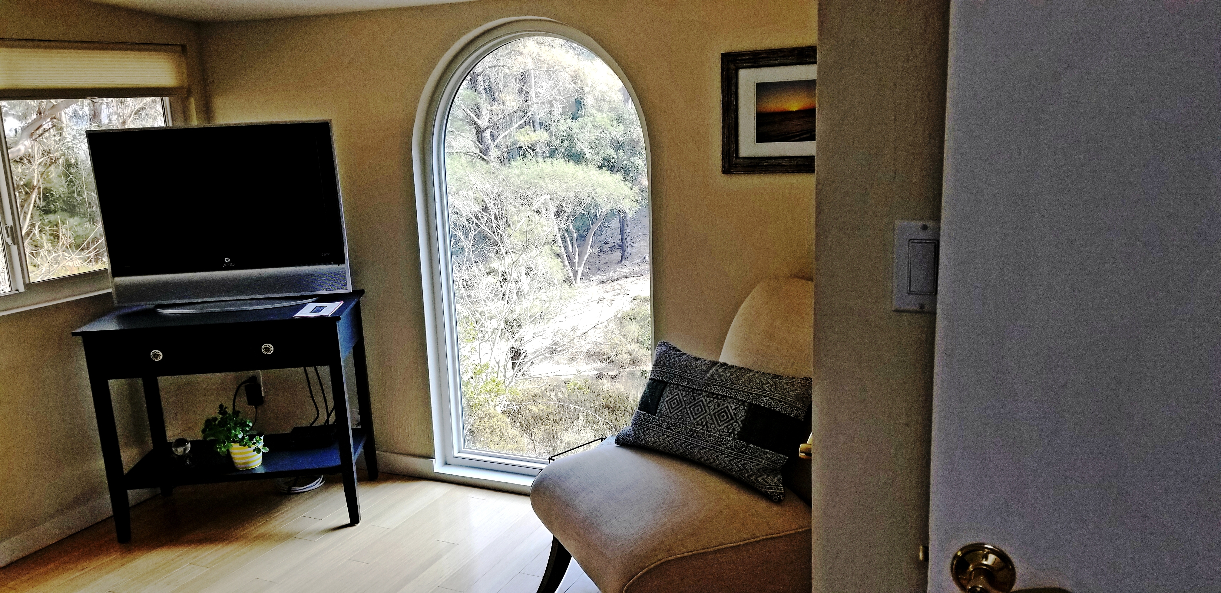 - Furnished living area with couch, upholstered chair, desk/chair, and skylight.